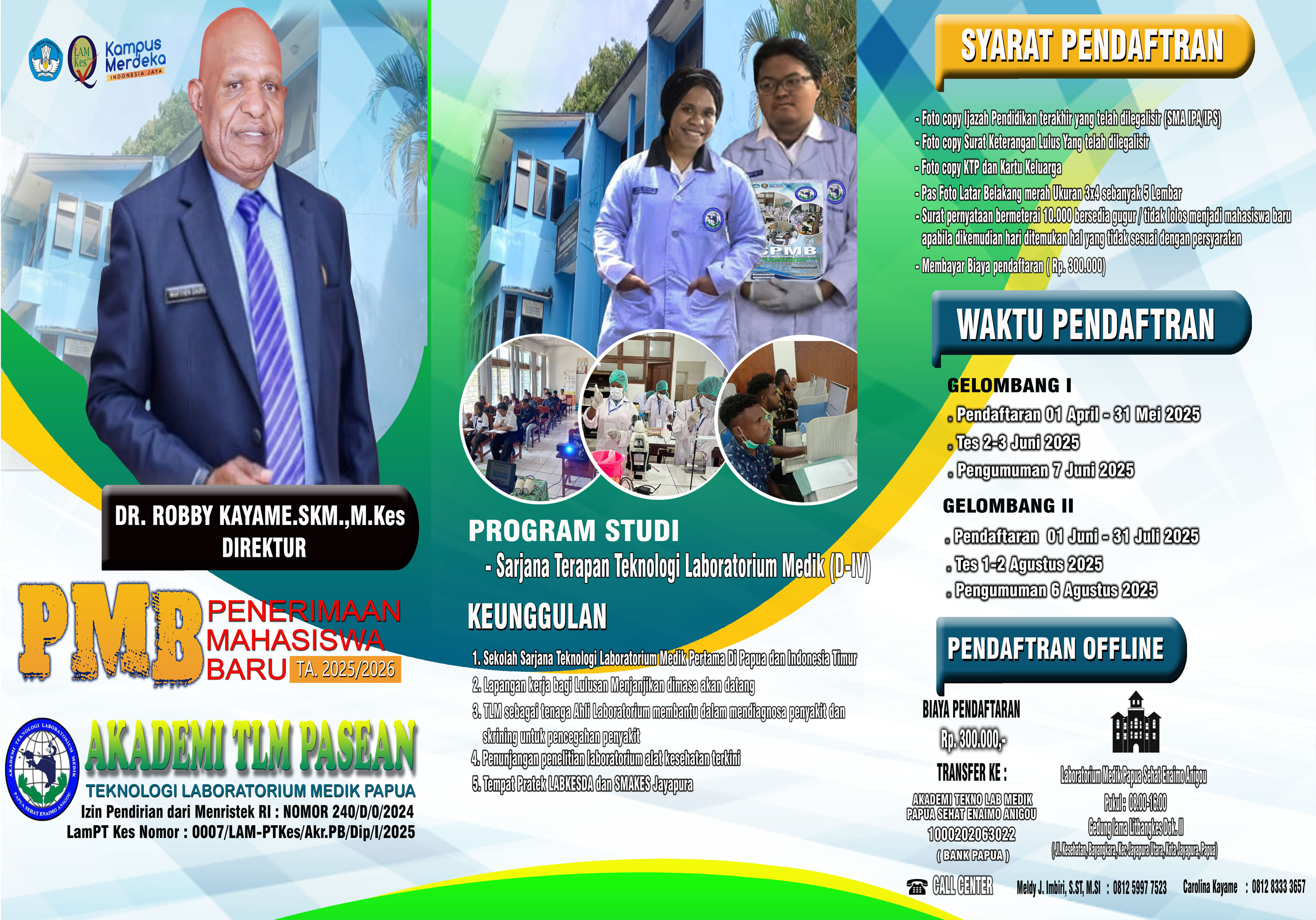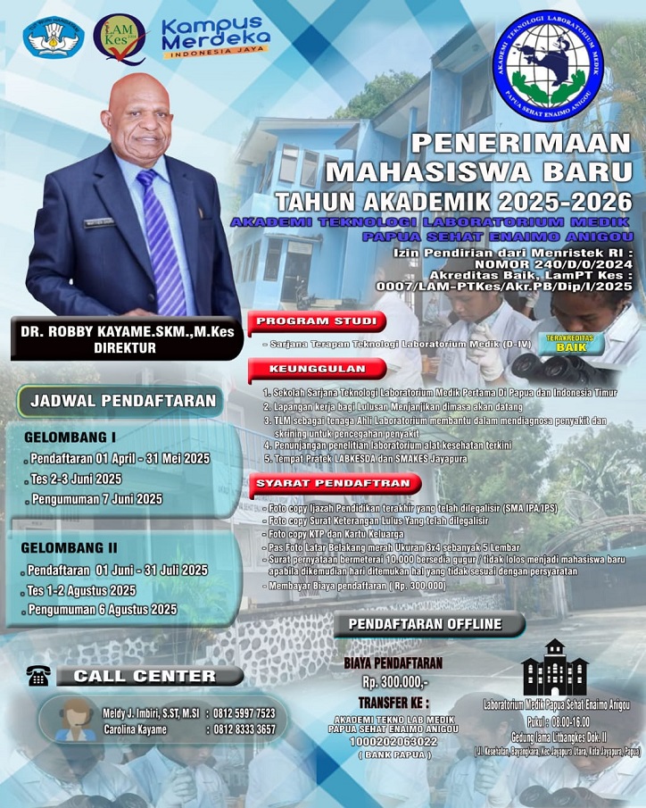 Kami mengundang Anda untuk bergabung dengan kami di Akademi Teknologi Laboratorium Medis Papua (Pasean), sebuah institusi terkemuka yang berdedikasi untuk mencetak tenaga laboratorium medik berkualitas di Provinsi Papua. Dengan program pendidikan Diploma IV , serta fasilitas modern dan tenaga pengajar yang berkompeten, kami siap membantu Anda mewujudkan impian di bidang kesehatan. Dengan Izin Pendirian Menristek RI : Nomor 240/D/0/2024 Akreditasi Baik LamPT Kes.007/LAM-PTKes/Akr.PB/Dip/I/2025 Sekolah Sarjana Teknologi Laboratorium Medik Pertama di PAPUA dan Indonesia Timur. Mari bergabung bersama kami dan menjadi bagian dari komunitas yang berdedikasi untuk meningkatkan kesehatan masyarakat.